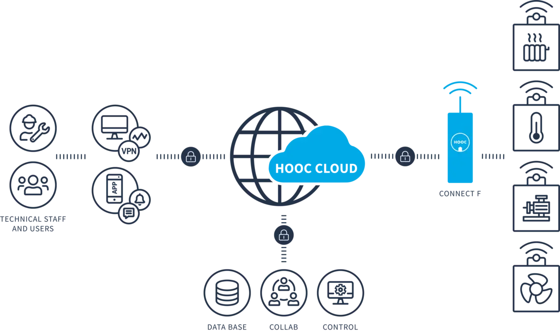But what makes it so indispensable? Let’s see: LoRaWAN stands for Long Range Wide Area Network. What at first might sound rather complicated, is actually quite simple: Where other wireless technologies (like your Wifi at home) have a locally limited transmission range, LoRaWAN will send (mostly via sensors) small size data packages over long distances. The LoRa network operates in low power mode and provides also deep indoor coverage. This is especially useful for installations in basements, multi-floor buildings and technical rooms. And to top it all off, HOOC has developed his own LoRa network, so that its solution will not only provide you with deep and large wireless coverage at reasonable prices, but also meet the highest security and safety standards.