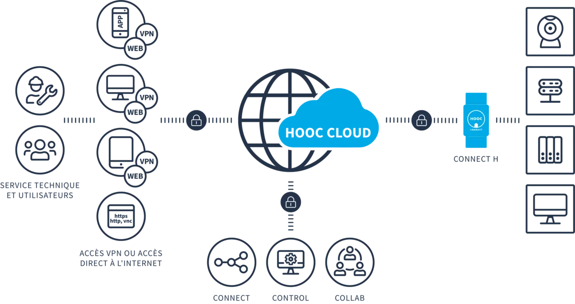 Et pour tous ceux qui n'aiment pas se limiter, HOOC Access offre encore une pléthore d'autres services. Que ce soit le « Secure Proxy » pour l'accès web rapide, le « Smart User Management » pour la gestion des droits ou le « History Log » pour le suivi des processus; vous avez l'embarras du choix. Ces outils vous garantissent que ce n'est pas uniquement l'accès en lui-même qui est hautement sécurisé, mais aussi son utilisation. C'est-à-dire que vous pouvez attribuer des accès VPN limités à certaines personnes (techniciens, fournisseurs ou autres) et si vous le désiriez, vous serez automatiquement informé(e) à chaque fois quelqu'un se logue dans votre système.