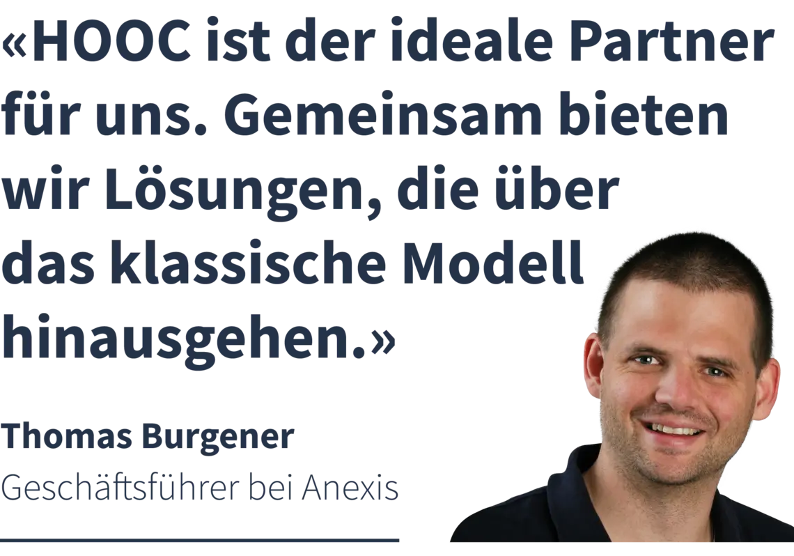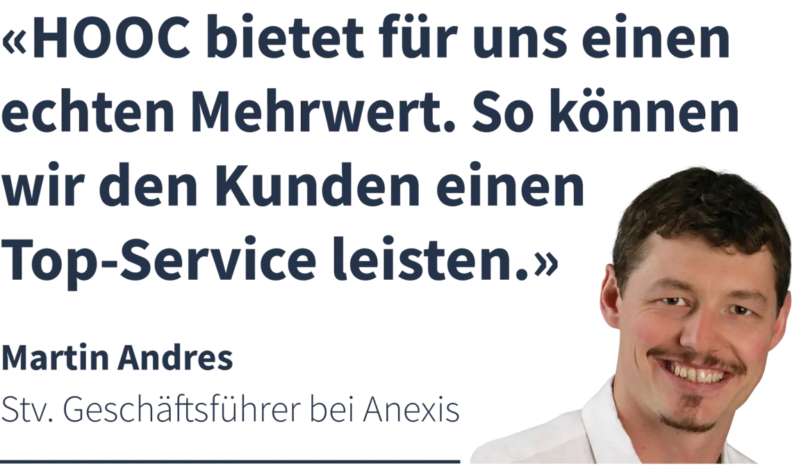 Wir arbeiten jetzt schon seit einigen Jahren mit dem Team von Anexis zusammen. Ihre absolute Kundennähe und ihre massgeschneiderten Lösungen im Bereich der Analyse und Optimierung von Gebäudetechnikanlagen kommen auch uns zu Gute. Dank dem grossen Vertrauen, das die Kunden in ihren Service haben, lassen sie sich meist auch davon überzeugen, dass die Installation einer HOOC-Lösung für sie einen langfristigen Nutzen darstellt.